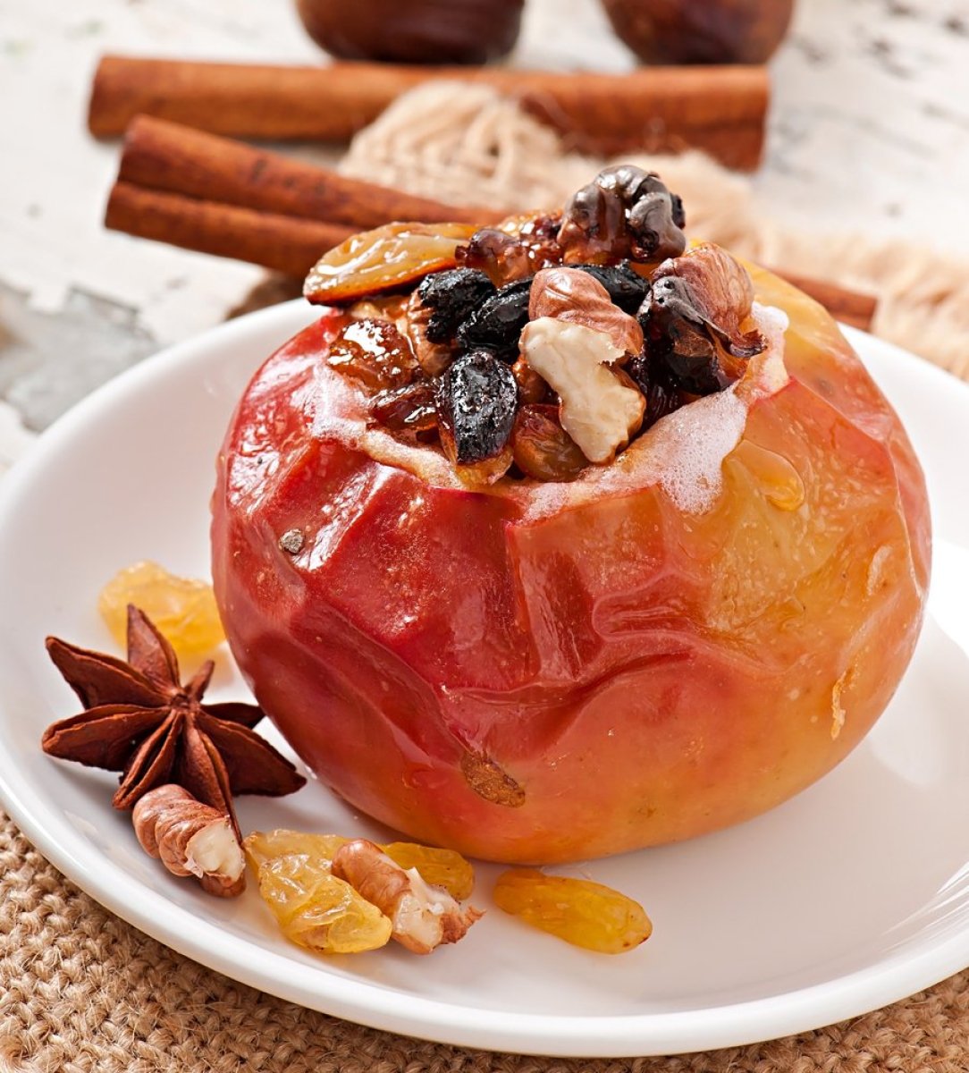 U maloj činiji pomešaj orahe, med, cimet i suvo grožđe. Napuni jabuke ovom smesom. Po vrhu stavi malo putera.