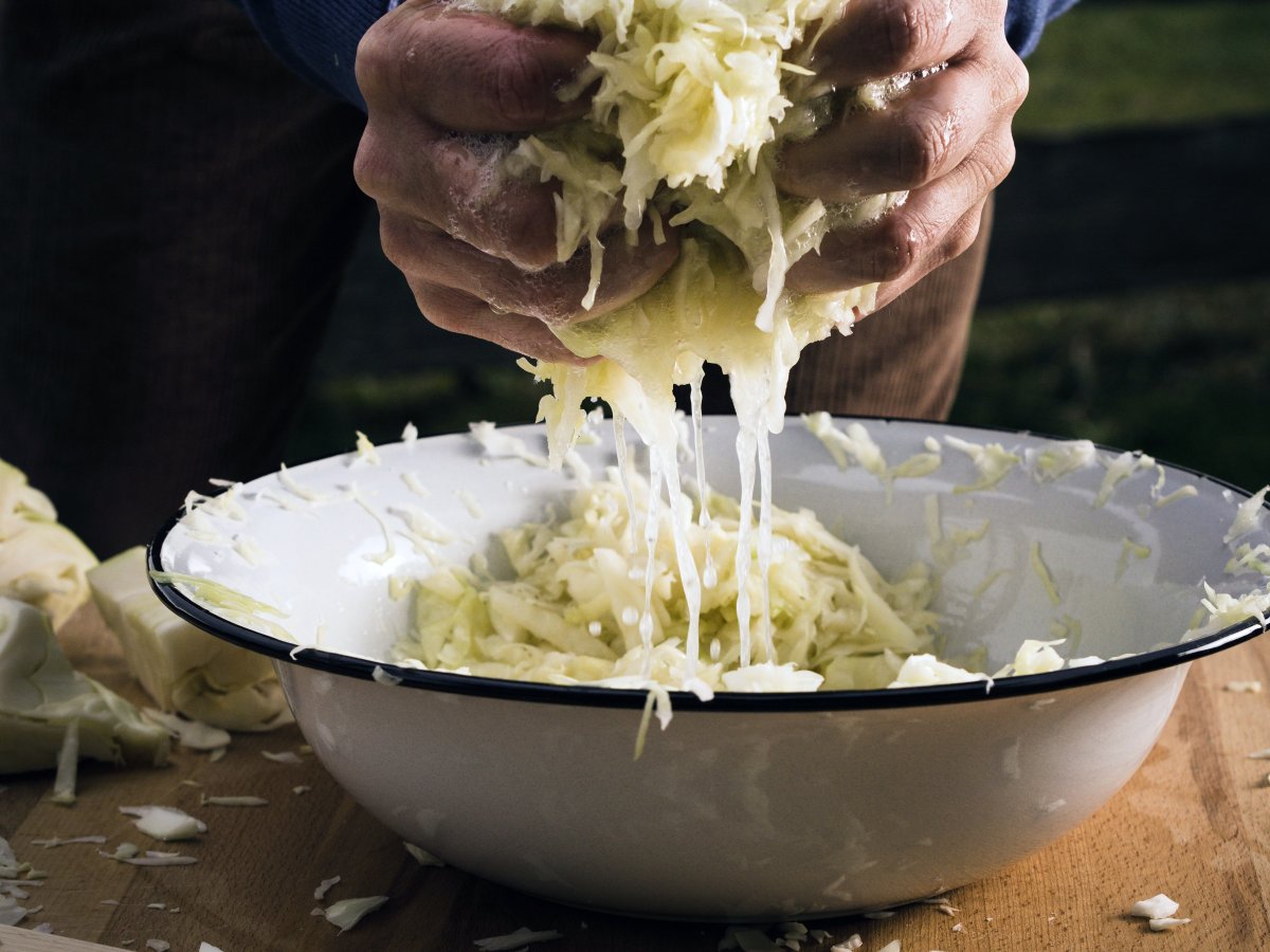 U velikoj posudi pomešajte seckani kupus sa zrncima bibera, alevom paprikom, klekom i semenkama kima. Pospite odozgo 20 g soli i sve dobro izgnječite rukama kako bi se sastojci sjedinili. Pokrijte posudu kuhinjskom krpom i ostavite da odstoji oko pola sata.