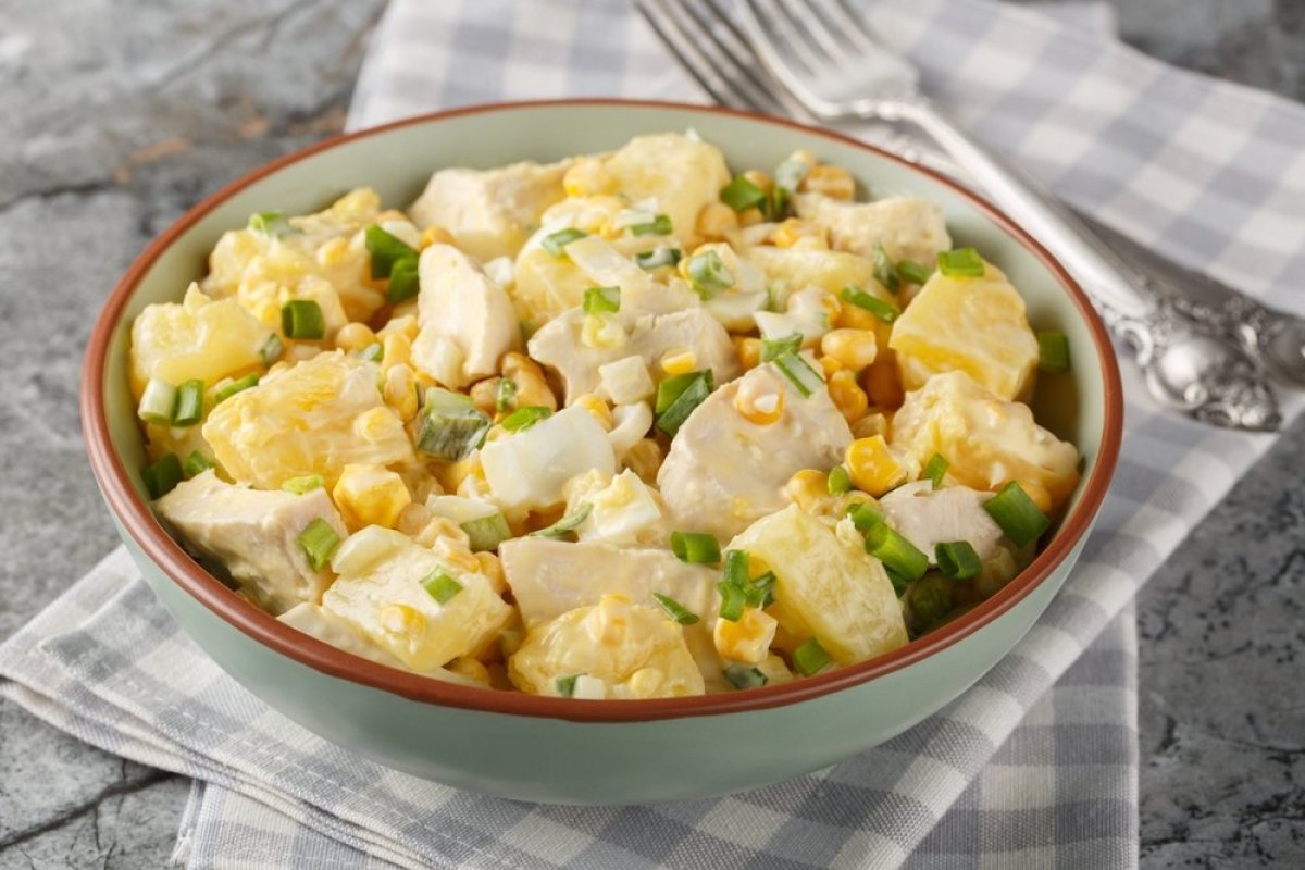 Za ovu salatu pileći file skuvajte i isecite na kockice i začinite. Ananas isecite na na komadiće, kao i 20 g oraha. Kuvana jaja narendajte na krupno rende, a kačkavalj na sitno rende.