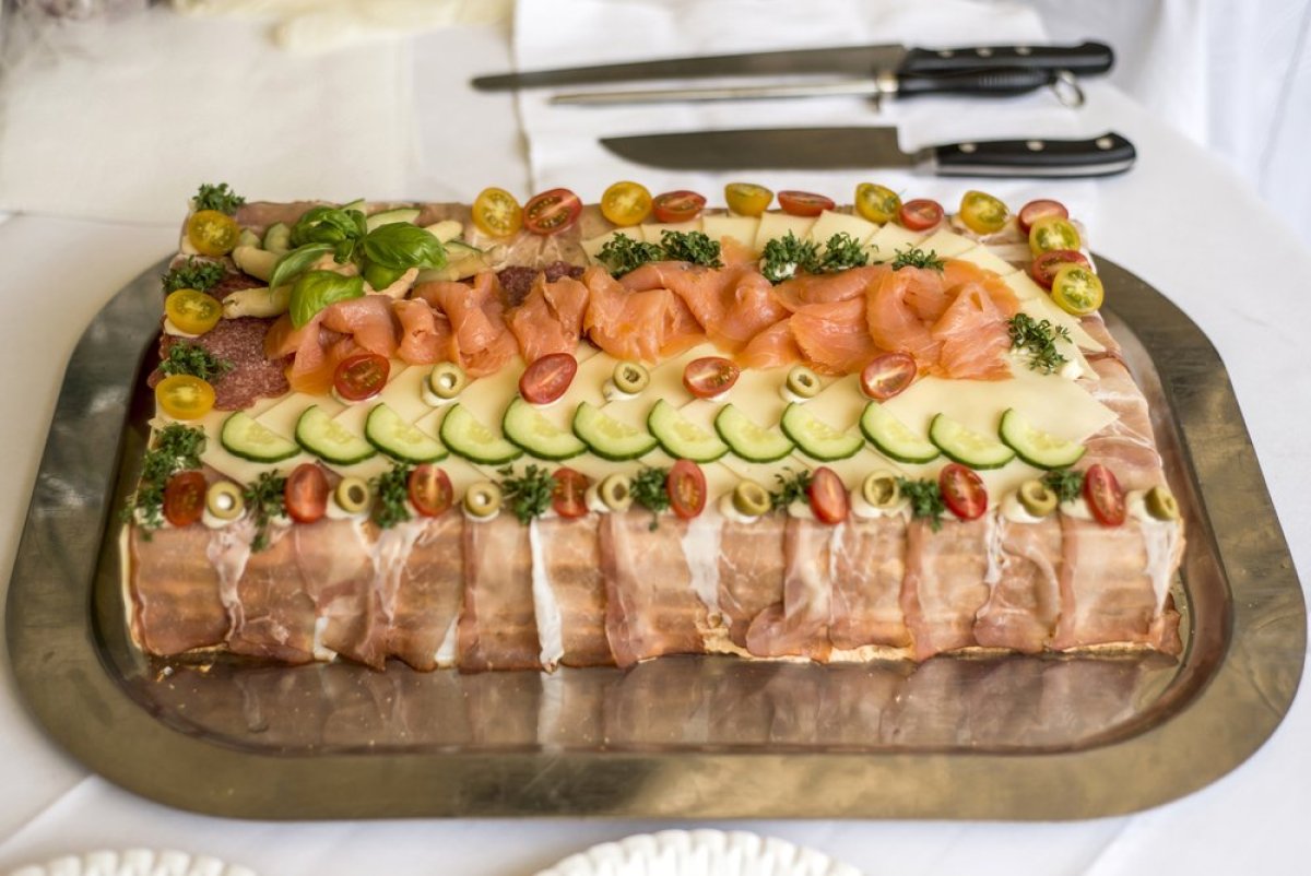 Na donju oblandu nanesite tanak sloj fila od pavlake i majoneza, pa preko poređajte rendanu šunku i jaja. Blago posolite i pobiberite.