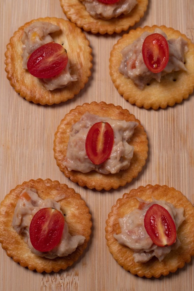 Tunjevinu procedite, pa stavite u posudu. Dodajte sitno seckanu pečenu papriku i vlašac, kao i posni majonez, senf i ljutu mlevene papriku. Posolite i poibiberite, pa dobro sjedinite. Bogato premažite krekere, pa polovinu ukrasite polovinom čeri paradajza, a drugu polovinu kiselim krastavcima koje ste isekli kao lepezu.