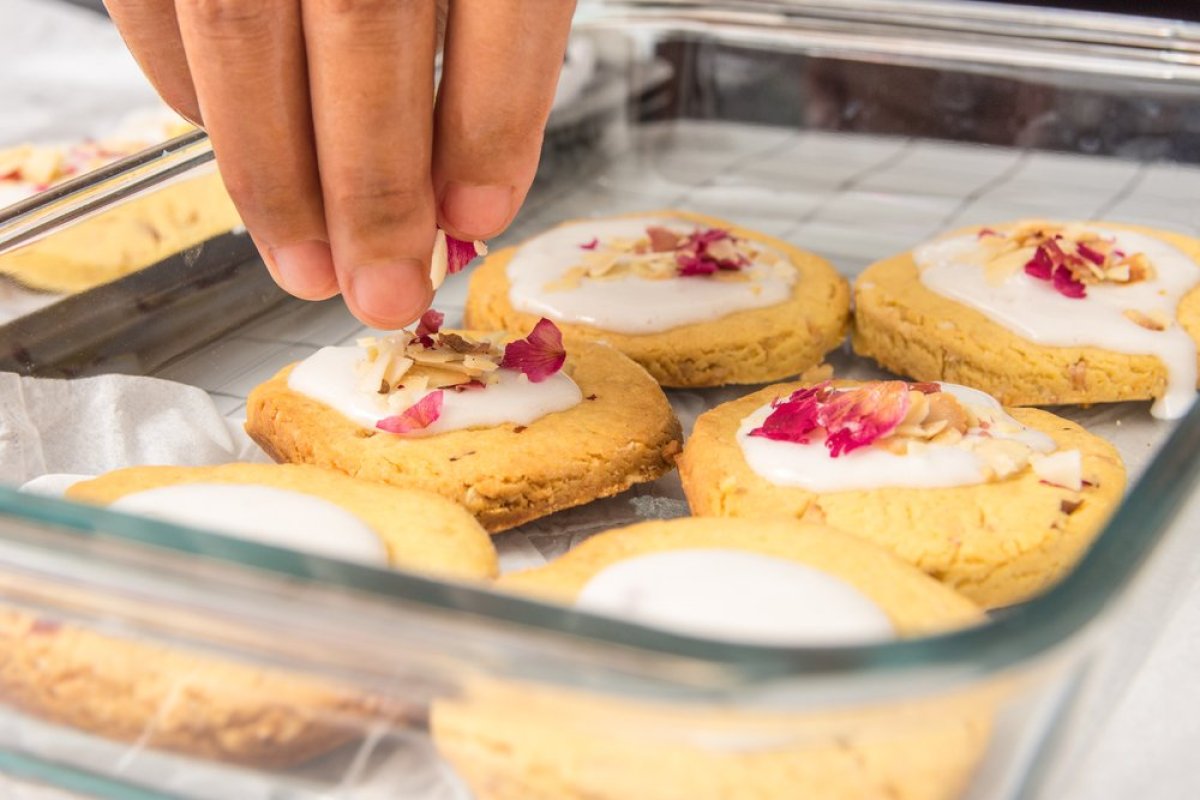 Pistaće i keks krupnije izblendirajte, pa pomešajte u posudi. Dodajte brusnice i čokoladu (250 g) koju ste istopili sa biljnom pavlakom, pa pomešajte rukama. Smesu za sitne kolače utisnite u tepsiju koju ste obložili pek papirom. Pokrijte i stavite u frižider na pola sata. Istopite belu čokoladu (200 g) i prelijte preko podloge od keksa. Ostavite u frižideru još 10 minuta da se stegne. Dekorišite preostalom istopljenom čokoladom, seckanim pistaćima i laticama ruže. Isecite na kocke i služite ove sitne kolače na slavskoj trpezi.