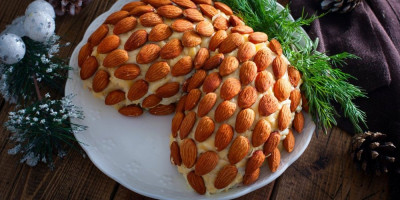 Oblikujte dobijenu smesu tako da liči na šišarku i prebacite je na tanjir. Zatim rasporedite bademe preko vrha, da izgled podseća na pravu šišarku.