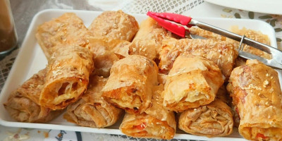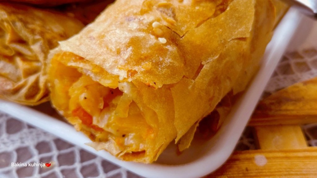 Preko nje stavite drugu koru, ali nju ne premazujte ničim. Na tu drugu koru rasporedite ravnomerno fil sa krompirom, lukom, paprikom i paradajzom. Zarolajte kore u rolnu. Rolnice ređajte u pleh i onda ih presecite po sredini.