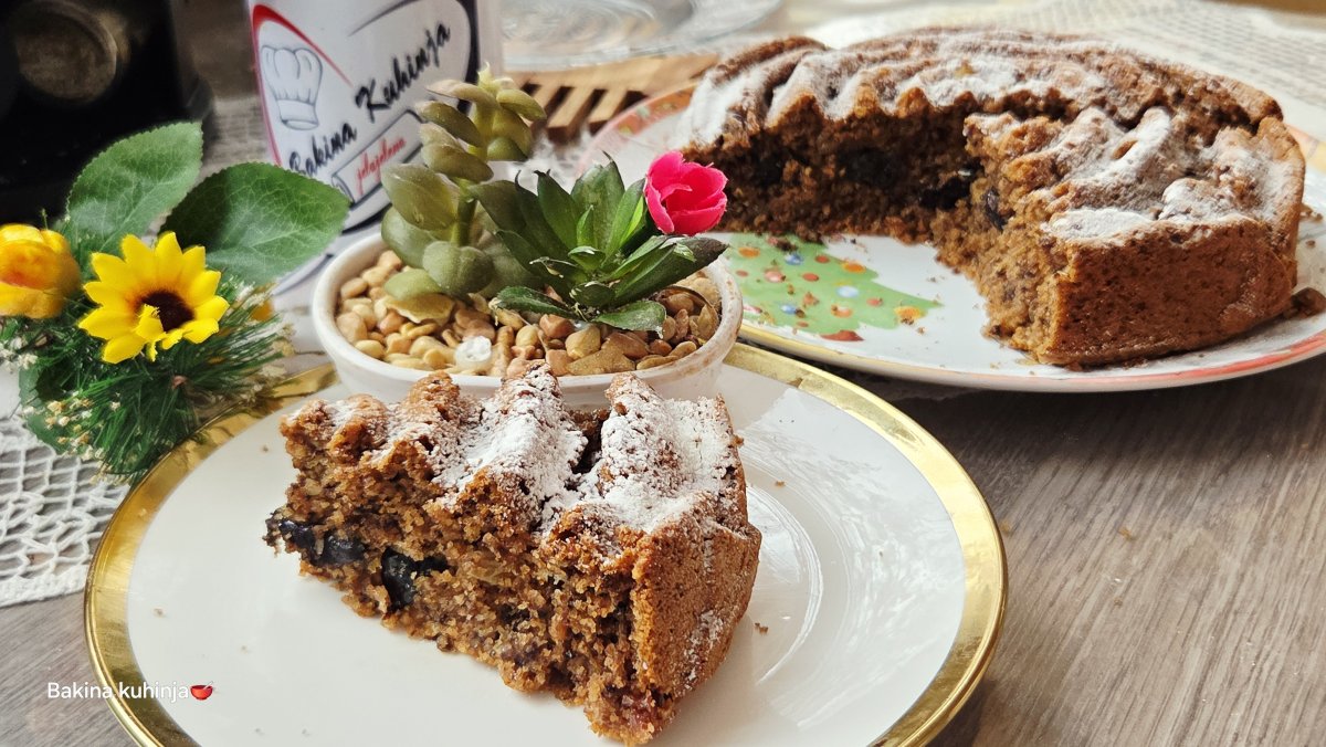Zatim postepeno dodavati suve sastojke: šećer, griz, mlevene orahe, vanilin šećer i kašičicu cimeta, a na kraju brašno koje ste prethodno prosejali sa praškom za pecivo.