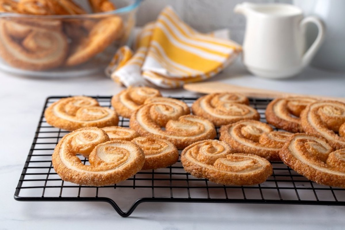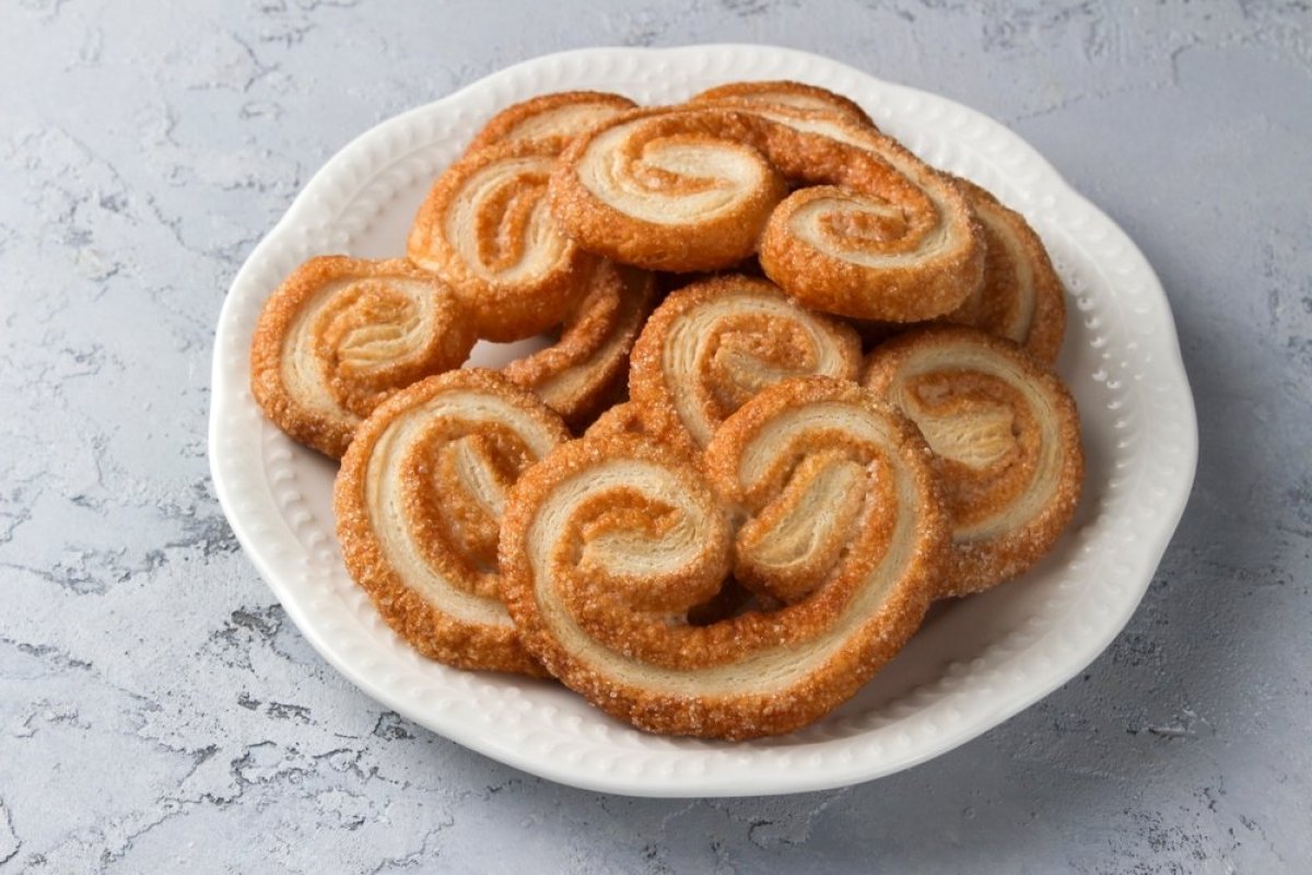 Dobijeni rolat isecite na tanke kriške i poređajte ih na pleh obložen papirom za pečenje. Pecite u prethodno zagrejanoj rerni dok palmiers ne poprime lepu zlatnu boju i postanu hrskavi.