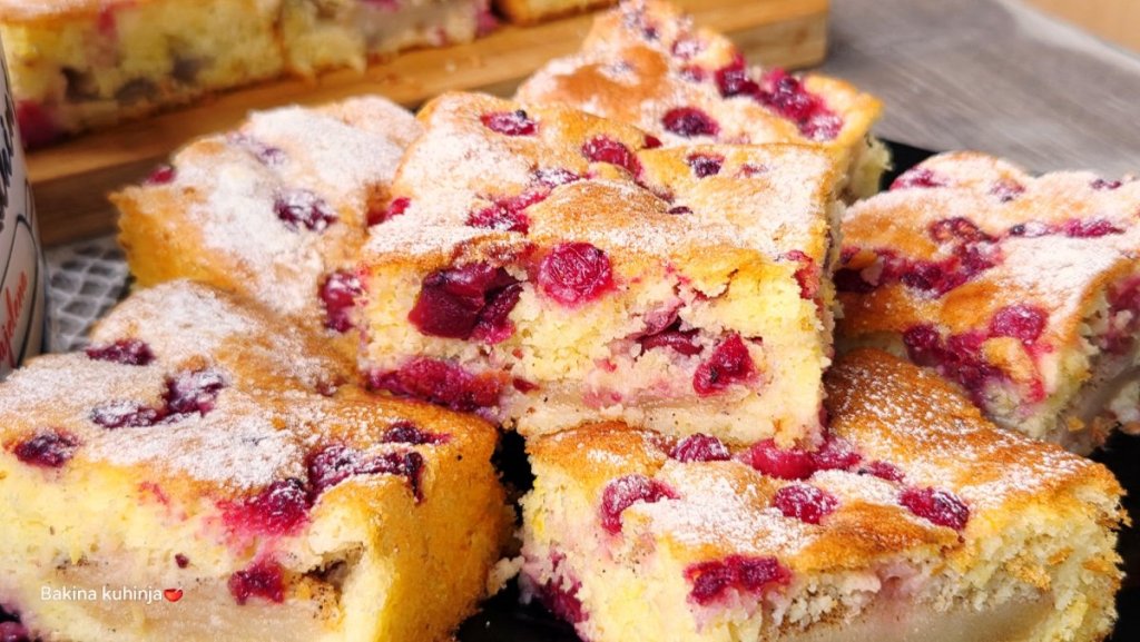 Na kraju prelijte ostatak testa i pecite u prethodno zagrejanoj rerni na 200 stepeni Celzijusa oko 40-45 minuta. Gotov kolač pospite vanilin šećerom.