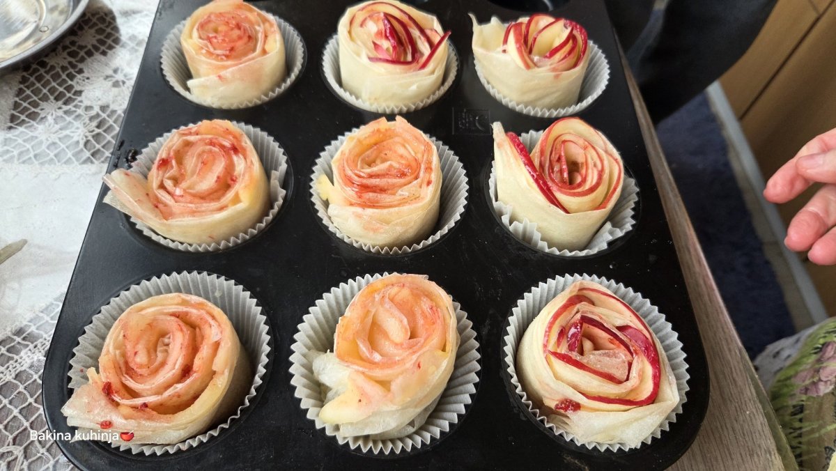 Gotove ružice ređajte u kalupe za mafine (po želji sa papirnim korpicama). Odozgo ih blago premažite džemom ili slatkim i dodajte malo ulja. Pecite na umerenoj temperaturi 30-40 minuta, dok lepo ne porumene.