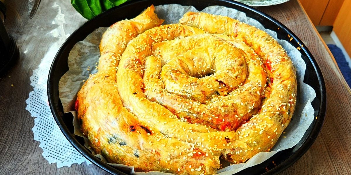 Ređajte u podmazan pleh krenuvši od centra u krug pa nastavljajte ostale rolnice dok ne popunite pleh. Pecite u zagrejanoj rerni na 200 stepeni oko 40 do 45 minuta dok pita ne dobije zlatnu boju.
