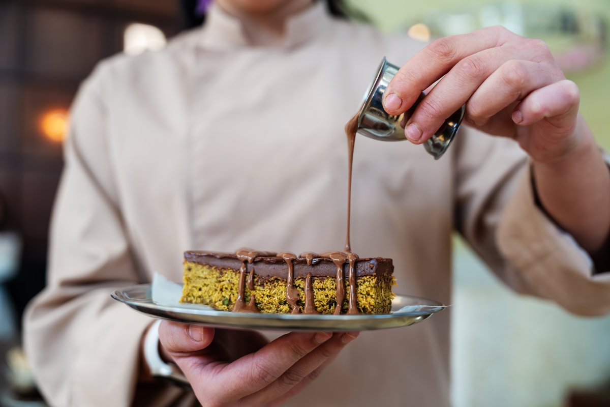 U torti je ta ideja pretvorena u bogat slojeviti kolač. Osnovu čini sočna čokoladna kora koja daje pun i intenzivan ukus, dok preko nje dolazi hrskavi sloj kadaifa pomešan sa kremom od pistaća.