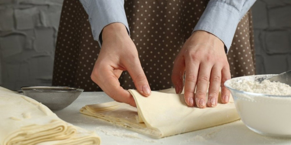 Razvucite testo u pravougaonik, premažite puterom i preklopite ili urolajte. Postupak ponovite nekoliko puta da biste dobili slojeve.