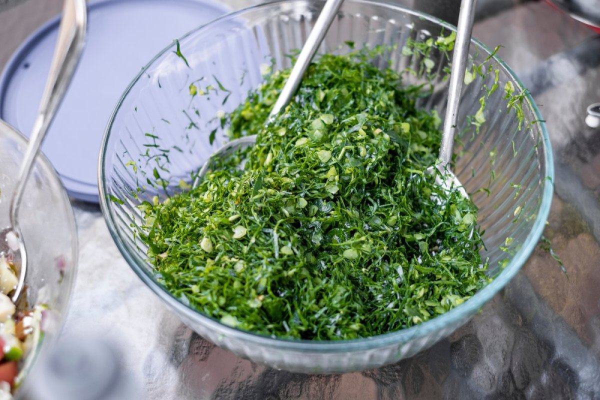 Raštan dobro operite, uklonite tvrde delove i isecite na krupnije trake. Ako su listovi stariji, kratko ih prokuvajte i ocedite.