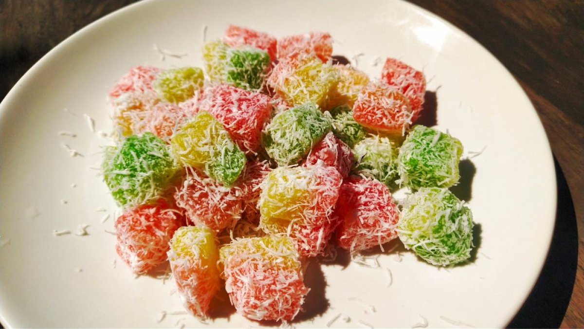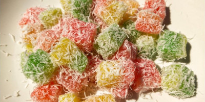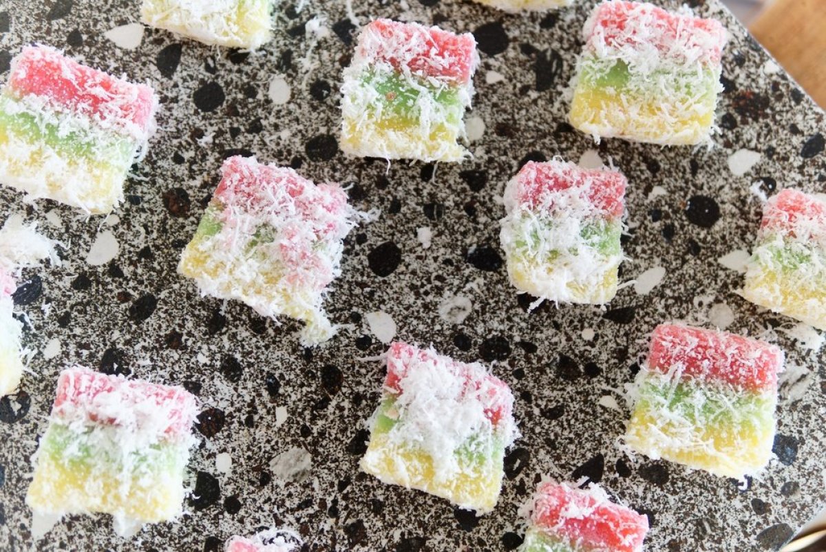 Patišpanj isecite na kocke, umačite u obojenu glazuru i uvaljajte u kokos.