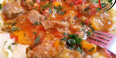 2. Ubaciti meso na kocke seckano. Dodati malo vode i dinstati oko 50 minuta.