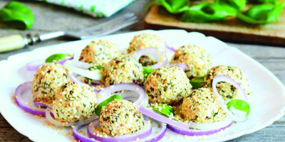 Mikserom umutite maslac pa dodajte sir i dobro sjedinite. Rendani kačkavalj i gorgonzolu umešajte viljuškom u maslac, pa na kraju i listiće sitno seckanog bosiljka. Smesu stavite u zamrzivač da se stegne. Očistite luk i isecite na tanke kolutove, a u tiganju prepecite susam. Kad se susam ohladi, stavite ga u malu činiju. Kašikom za sladoled vadite sir, kuglicu uvaljajte u susam pa ređajte na tacnu. Dekorišite kolutima luka, listićima bosiljka i pospite ostatkom susama.
