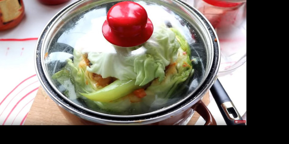 Dodati kašiku ajvara začin, biber, so i sve dobro izmešati. Sa tim napuniti kupus i poklopiti sa onim delom što smo odsekli.