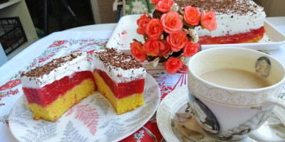 Ostavite da se prohladi pa ga sipajte na biskvit i dobro rasporedite. Ohladite pa odozgo stavite umućen šlag. Dobro ohladite i sladite se.