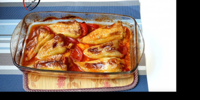 Paprike oprati i izvaditi seme. Sir izdrobiti, dodati jaje, griz, seckanu šunku, seckane maslinke i začine po želji. Sve izjednačiti i puniti paprike, pa zatvoriti kolutovima paradajza. Tepsiju podmazati uljem i poređati paprike. Premazati ih uljem i dodati malo kuvanog paradajza oko 100 ml.
