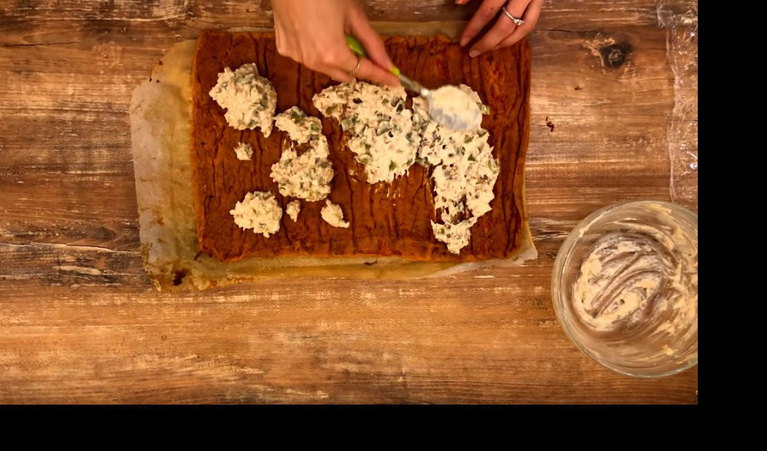 Odmotajte ohlađeni rolati i odvojte ga od papira za pečenje. Rasporedite fil po rolatu i ravnomerno razmažite. Rolat zatim ponovo zamotajte u providnu foliju i stavite u frižider da odstoji par sati, a najbolje preko noći da se svi sastojci sjedine.