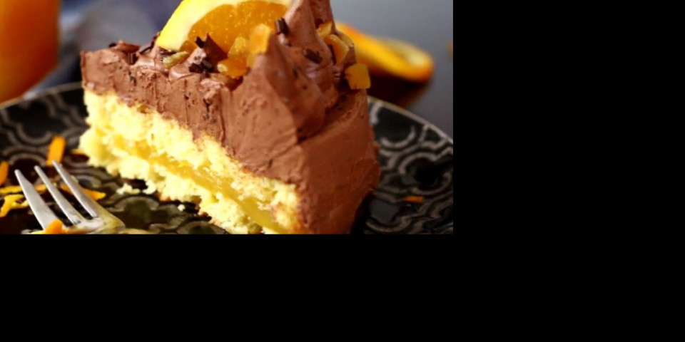 Koru prerežite na pola. Pažljivo smestite žele naglavačke (pogledaj video). Odlepite pažljivo papir za pečenje. Pošto se kora malo skupi kod pečenja, postoji mogućnost da će vam žele biti malo veći, pa stavite drugu polovinu biskvita na žele i odrežite višak želea, ako ga ima. Lagano pritisnite torticu. Bogato premažite tortu, iskoristite pola fila. Drugu polovinu stavite u vrećicu za ukrašavanje i pravite male puslice, da dobijete na visini torte. Gore pospite kandiranu pomorandžinu koru i ostavite da ohladi još kratko.
