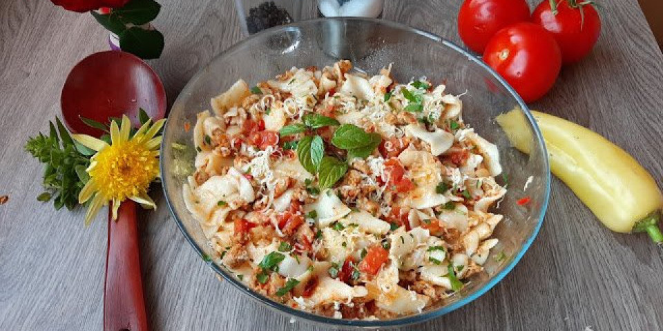 Skuvati testeninu, a luk sitno iseckati, pa propržiti na ulju. Dodati seckanu zelenu papriku. Kada se sve to malo proprži dodati mleveno meso. Dinstati 20 min., pa ubaciti paradajz na kockice, seckan beli luk, crvenu papriku i tucanu ljutu. Na kraju ubaciti začine. Testeninu procediti, pa izmešati sa prženim mlevernim mesom. Odozgo narendati kačkavalj.