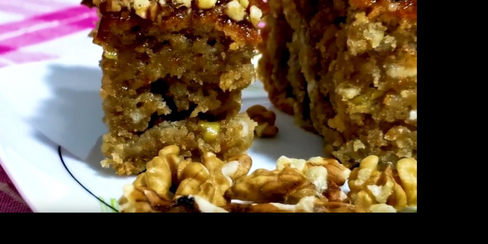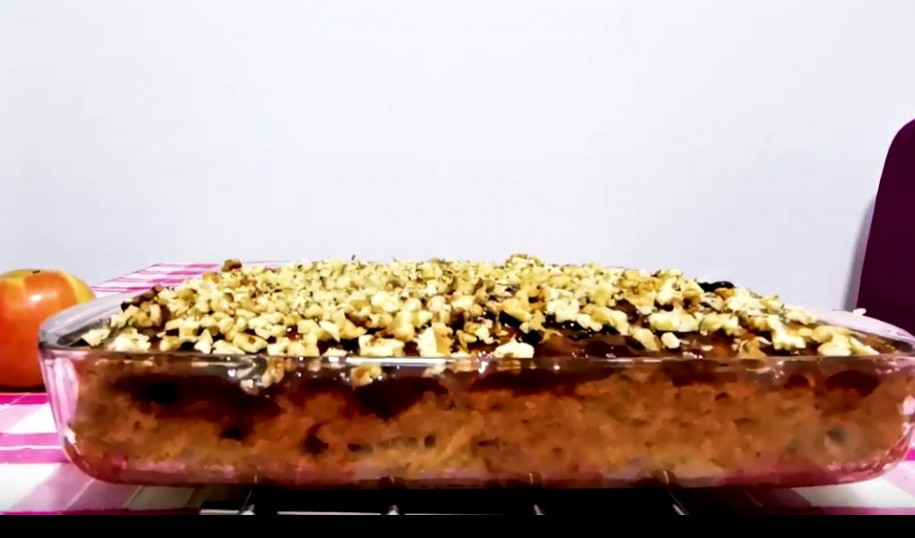Izrendajte jabukе. Stavite suvo grožđe u sud i dodajte šećer. Promešajte sve sastojke i ostavite da odstoji oko pola sata. Dok jabuke ne puste svoj sok. Potom dodajte belo brašno i integralno brašno i prašak za pecivo dodajte i ulje. Promešajte sastojke sve i raspodelite u nauljeni pleh. Pecite 40 minuta na 200c. Potom izvadite pleh iz rerne i premažite kolač džemom od kajsija. Isitninte orahe i dodajte preko kolača. Servirajte i uživajte u njemu.