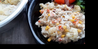 Flekice skuvati, a karfiol obariti. Seme susama i suncokreta na tiganju malo ispeći da porumene. Sve dobro ohladiti. U flekice dodati seckanu papriku i luk, majonez, senf, kukuruz, karfiol, seme susama i suncokreta i tunjevinu koju ste ocedili od masnoće. Sve dobro izjednačiti i salata je spremna.