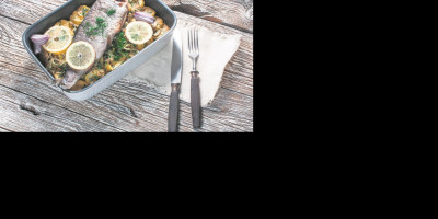 Krompir obariti u slanoj, ključaloj vodi, desetak minuta. U tiganju zagrejati ulje, pa kratko propržiti crni luk. Dodati beli luk, pržiti još minut, pa preručiti u vatrostalnu posudu. Dodati obaren krompir, isečenu papriku, čeri paradajz, pa posoliti, pobiberiti i promešati. Odozgo staviti očišćenu, opranu i prosušenu pastrmku, preko ribe celer i peršun, te sve zaliti belim vinom. Prekriti folijom i peći u rerni na 180 stepeni oko pola sata. Skloniti foliju i peći dok riba ne dobije lepu boju. Poslužiti dok je toplo.