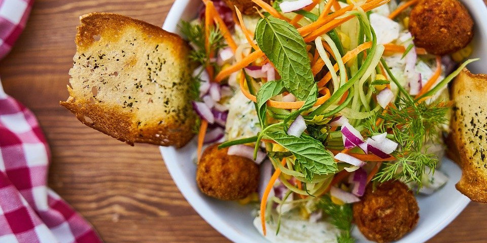 Staviti slaninu u hladan tiganj. Uključiti ringlu i zagrejati tiganj. Pržiti slaninu dok ne postane zlatna. Izvaditi iz tiganja. Sipati 20 ml maslinovog ulja u isti tiganj. Zagrejati na srednoj vatri. Propržiti očišćenu i prepolovljenu džigericu. Preliti vinom i skinuti tiganj sa ringle. Iseckati džigericu na manje komade i začiniti je soja-sosom i biberom. Ostaviti da se ohladi na sobnoj temperaturi. Zagrejati rernu na 180°C na duvanje. Grubo iseckati hleb na kockice. Preliti preostalim maslinovim uljem i začiniti solju. Peći do 10 minuta. Iseckati luk na polumesece i iskidati crveni kupus. Pomešati crveni kupus, rukolu, spanać i luk u velikoj posudi. Umešati senf sa medom, sirćetom, maslinovim uljem, solju i listovima timijana dok se ne dobija glatka smesa. Začiniti salatu prelivom i izmešati. Servirati sa mlevenim plavim sirom, slaninom, džigericom i hlebom.