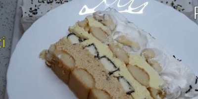 Sastojci: 400 g piškota, 15 čokoladnih bananica, 300 g mlevenog keksa, 3 dl soka od pomorandže, 3 pudinga sa ukusom vanile, 1,5 l mleka (750 ml za puding, 300 ml za šlag i ostatak za potapanje piškota), 2 margarina, 500 g šećera u prahu, 5-6 banana (oko 1.2 kg), 300 g šlaga.