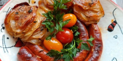 Krompir očistiti i iseći na tanke listiće, može i na rende. Posoliti, dodati sve začine, pouljiti i izmešati. Pleh obložiti pek papirom i u sredinu staviti kobasice. Krompir stavljati na gomilice jedan pored drugog u krug oko kobasica. Još malo preliti uljem i peći na 200 stepeni oko 50 minuta.