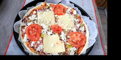 Namazati kečapom, dodati seckanu šunku, sečene masline, kačkavalj, rendan sir i origano. Može i manji paradajz.