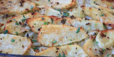 Priprema: Tepsiju podmazati uljem. U činiji iseći krompir na listiće, dodati malo začina, peršunov list, biber, ulje, beli luk i kukuruzno brašno. Sve dobro izmešati pa polovinu ređati u pleh.