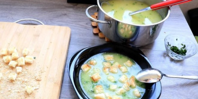 Na ulju propržite kašiku brašna, dodajte seckan beli luk, pa kad porumeni sipajte oko 2 l vode. Pustite da vri 2-3 minuta, dodajte začin, peršunov list, mleven biber... Kad je jelo gotovo prepečen hleb isecite na kockice i dodajte u tanjir sa čorbicom.