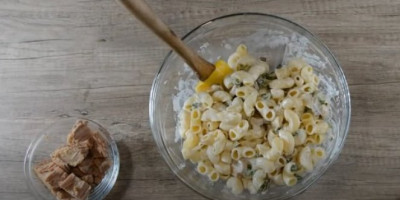 Skuvajte testeninu, ocedite pa operite ispod jakog mlaza vode. Ostavite sa strane. Skuvajte i kukuruz šećerac, pa ga ocedite i pomešajte sa testeninom. Dodajte komadiće tunjevine, majonez i začine pa sve izmešajte. Po volji možete dodati i masline.