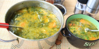Na ulju propržite rendanu i seckanu šargarepu, dodajte seckani crni luk i propržite. Dodajte koren peršuna isečen na kolutove i seckani spanać. Nalijte vodom i kuvajte oko 20 minuta. Dodajte pirinač i njega kuvajte 5-7 minuta. Ubacite začin, biber i peršunov list. Probajte i dodajte soli po ukusu.