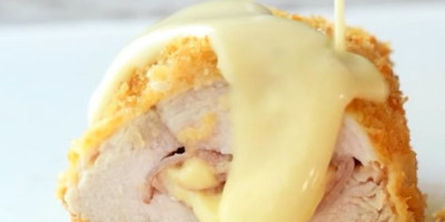 Pileće grudi istucite tučkom za meso, pa poslite i pobiberite. Sitno seckani beli luk i senf pomešajte i tom smesom premažite piletinu. Stavite komade kačkavalja i urolajte. Tako pripremljeno meso uvite u slaninu i stavite u pleh. Zatim u posudi pomešajte jaja, kiselu pavlaku, pavlaku za kuvanje, mirođiju, so i biber i prelijte meso tom smesom. Pecite pola sata na 200 stepeni. Zatim izvadite iz rerne, pospite kačkavaljem i pecite još 10 minuta.