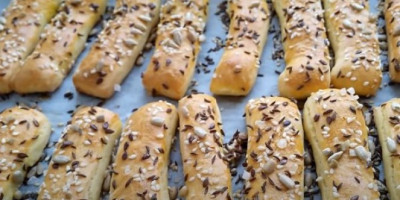 Preostalo jaje umutiti i malo posoliti pa premazati štapiće, posuti nekim semenkama,po želji. Ne brinite, neće se slepiti, još će se malo skupiti pa će biti svaki za sebe poseban.