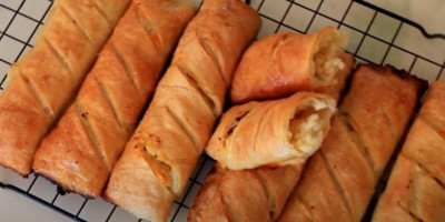 Izmešajte sve sastojke za preliv. Mažite pet kora ovim prelivom, za svaki premaz ide 3-4 kašike preliva. Isecite na četiri dela, stavite sir, umotajte i svaku pitu zasecite ukoso. Prelijte ostatkom preliva i ostavite deset minuta na tepsiji, višak preliva istresite. Pecite na 200 stepeni dok ne porumeni, oko 30 minuta.