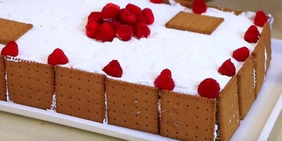 Piškote umkati u mleko i ređati u posudu. Preko piškota rasporediti polovinu malina, zatim prekriti polovinom fila. Ponoviti postupak još jednom (piškote, maline, fil) Staviti u frižider da se stegne pre posluženja.