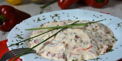 U adekvatnu činiju staviti oceđene marinirane pečurke, na rebarca isečen crveni luk, sitno seckan beli luk i iseckanu papriku, pa promešati.