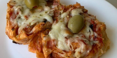 Na radnu površinu stavite jednu koru, premažite je uljem, stavite preko drugu koru, premažite je pavlakom i nabacajte pečurke, ponovo stavite koru, premažite kečapom i pospite origanom, pa opet kora a na nju nerendan kačkavalj, kora - pa kečap i šunka, kora pa opet kačkavalj, zatim još jedna kora koju premažete uljem.