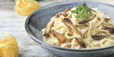 U dublji tiganj sipajte pola kašike maslinovog ulja, dodajte beli luk kratko prodinstajte (minut), dodajte oprane i iseckane pečurke. Posolite i pobiberite po ukusu, i dinstajte osam minuta, mešajući povremeno. Dodajte skuvanu testeninu i polovinu vode od kuvanja koju ste sačuvali.