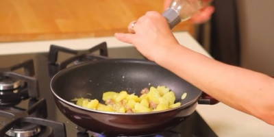 U istu posudu se sipaju krompir i mašnice, pa se pomešaju sa crnim lukom i alevom paprikom. Jelo je gotovo!