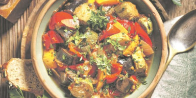 Iseckajte povrće, patlidžan i tikvice posolite da puste višak vode, pa obrišite papirnatim ubrusom. Na maslinovom ulju propržite patlidžan 10-12 minuta, izvadite iz tiganja, pa dodajte tikvice na 4 minuta i njih izvadite. Dodajte iseckani crni luk, grančice majčine dušice, beli luk i paprike. Posle 4 minuta dodajte paradajz i pržite još 8-10 minuta, u međuvremenu posolite. Na kraju dodajte patlidžan i tikvice, kuvajte sve još 5 minuta, sklonite s vatre i dodajte bosiljak.