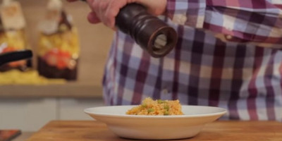 Ubacite opran pirinač, obareni grašak i ostatak supe. Promešajte, smanjite temperaturu na minimum i kuvajte poklopljeno dok pirinač ne upije tečnost.