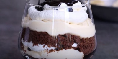 Zatim ga podelite na dva dela. U jedan deo dodajte slatku pavlaku i umutite, a u drugi deo istopljenu čokoladu i promešajte. Sipajte fil u čaše prvo beli, pa crni, ukrasite komadićima čokolade i jagoda.