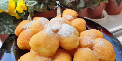 Pokriti krpom da odmore 15 minuta. U dublju šerpu sipati ulje, pa ubaciti naraslu krofnu zajedno sa papirom i posle par sekundi samo ga izvući ispod krofne. Pržiti sa jedne i sa druge strane da porumene na srednje jakoj temperaturi. Vaditi rešetkom na papirnu salvetu. Pospite sa prah ili vanilin šećerom po želji.