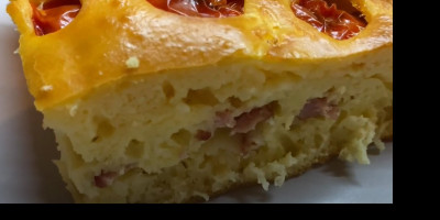 Priprema: Ulupati 3 jaja, posoliti, dodati jogurt, nastaviti mućenje. Staviti brašno i prašak za pecivo pa lepo sjediniti. Jednu polovinu smese preliti preko posude za pečenje, pa staviti suvo meso, zatim drugu polovinu. Dodati čeri paradajz. Peći na 200 stepeni 20-25 minuta. Prijatno!