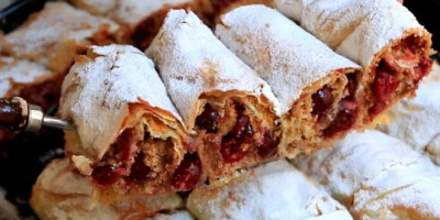 Kratko i na laganoj temperaturi ispržite prezle na ulju. Dodajte šećer i vanilu. Izmešajte vodu, ulje, šećer i ovim prelivom mažite tri ili četiri kore, na zadnju ne morate već bogato pospite prezlama i višnjama. Urolajte i slažite na tepsiju. Tako do kraja. Dobro ih naprskajte istim prelivom koji je ostao i ostavite da stoji deset minuta. Ukljucite rernu na 220°C i pecite oko 35 minuta. Gotovu možete (ali ne morate) poprskati vodom, prekrijte i ostavite malo da odstoji. Isecite i pospite šećerom.